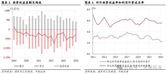当季,初次收入逆差贡献了经常项目顺差降幅的27%,该项逆差同比增长73%至243亿美元(见图表2),投资收益逆差同比增长72%至266亿美元。其中,对外投资收益同比减少15%至419亿美元,为2021年以来同期新低,由于我国对外金融资产中储备资产占比最高(一季度为35.9%),主要投向包括发达经济体债券,因此当季对外投资收益减少或反映海外债市调整影响,一季度10年期美债收益率累计上行32BP;外来投资收益增长5%至696亿美元,位列历史同期第四,仅次于2021年、2022年和2018年一季度的930亿、914亿和727亿美元,同期外商投资企业工业利润同比增长12.6%至3738亿元,位列历史同期第五(见图表3)。年化对外投资回报率连续三个季度回落,一季度降至2.2%,创历史新低,而外来投资回报率则相对稳定,一季度为5.6%,二者分别较2012年至2023年回报率均值下降0.9个、0.2个百分点(见图表4)。