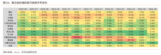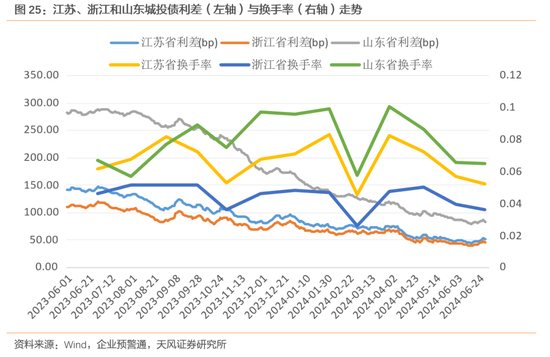 同样的,在重点省份中的成交活跃地区天津和云南,在其城投债换手率明显抬升后,对应利差出现了斜率陡峭的压缩。尽管后续换手率有所回落,但相较其他地区仍处在高位,未来可持续关注其换手率上升与利差压缩之间的关系。