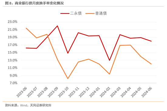 金融债细分方面,我们关注成交占比最大的商业银行发行的普通债和二永债,普通债换手率波动较大,且较期初大幅下降,流动性在波动减弱;二永债换手率则在18%附近波动,大部分时间高于普通债。