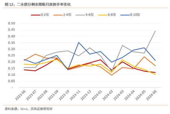 对金融债进行细分,我们关注二永债的换手率情况,其中剩余期限4-6年换手率在波动上升,其他期限二永债流动性较稳定,8-10年的换手率波动较大。