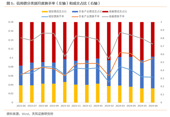 产业债细分行业方面,2024年3月以来,各行业换手率普遍出现一定程度上升,其中机械设备、传媒和电力设备行业换手率上升幅度较大。在月均成交量前十的行业中,银行、非银金融成交占比较大,但换手率变化不大;交通运输、煤炭和钢铁换手率处在波动上升的趋势中。