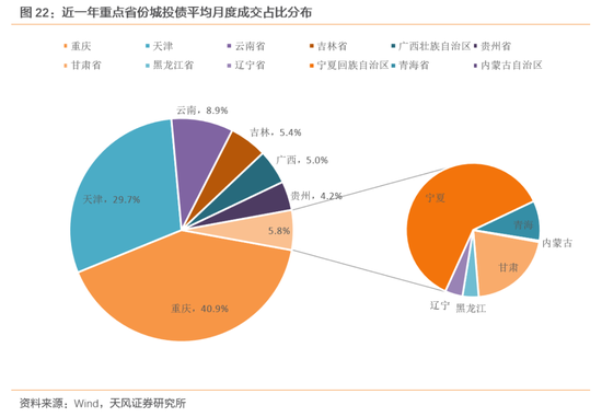 从成交量来看,最近一年重庆、天津、云南、吉林、广西和贵州6个地区的平均月度成交占比超过了94%,其余的甘肃、黑龙江、辽宁、宁夏、青海省和内蒙古6个地区成交占比则普遍不足1%,因此可以简单划分为“成交前6”和“成交后6”地区,这也符合当前城投债存续规模的分布情况。