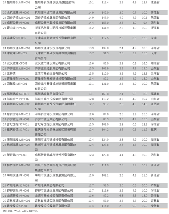 具体来看近一个月成交活跃的城投债个券。市场成交活跃前50的城投债个券中,收益率基本在2%-6%之间,剩余期限多在4-6年之间,地区分布上浙江、山东、天津和云南较多。24北排水GN001、24乌城投MTN004、24昆明新都MTN001的换手率较高,分别为235.5%、171.0%和169.0%。