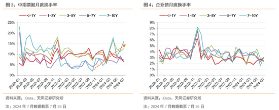 信用债中中期票据流动性高于企业债。2022年以来,7-10Y中票平均换手率为10%,企业债为4%,中票流动性明显高于企业债。从趋势上来看,2024年上半年7-10Y中票流动性整体上行,2024年4月达到阶段高点,为18%;企业债则整体较为稳定。