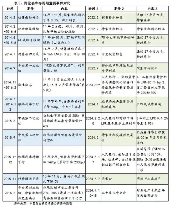 而本轮政策周期,从2022年2月销售面积累计面积转负、待售面积累计同比转正,4月70个大中城市房价转负、开发投资转负开始,已经连续27个月处于负值区间。从2022年9月部分城市阶段性取消房贷利率开始计算,政策宽松期也持续了近两年的时间。今年6月7日的国常会上明确了房地产“去库存”,二十届三中全会对房地产相关政策又进行了集中部署,房地产政策空间释放可期。