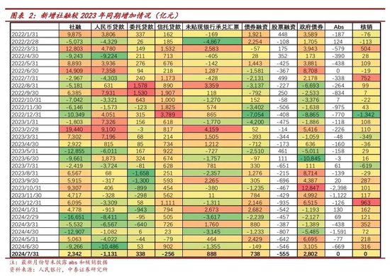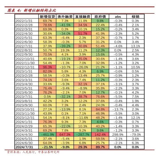 社融结构分析:1、新增投放情况。政府债融资为主。7月新增的贷款/政府债/企业债融资占比分别-21.5%/89.7%/26.3%,上月占比分别为64.1%/25.7%/6.5%。2、新增较2023年同期比较。7月单月社融规模同比多增2342亿元,主要是靠政府债同比多增拉动。具体来看,本月政府债融资继续同比多增2802亿元,不含非银的人民币贷款同比少增1131元,在信贷不足的情况下政府债对社融的支撑力度进一步增强;表外融资在去年的低基数下同比有所增多,其中委托贷款同比多增338亿元,信托类非标融资同比多减256亿元,新增未贴现的银行承兑汇票在去年较低的基数下同比少减888亿元。直接融资方面,上月企业债融资同比多增738亿元;股票融资在IPO和再融资政策持续收紧的背景下同比继续少增555亿元。