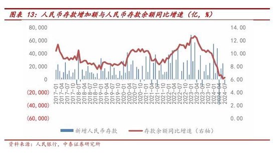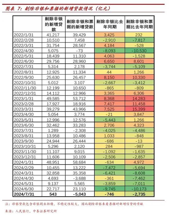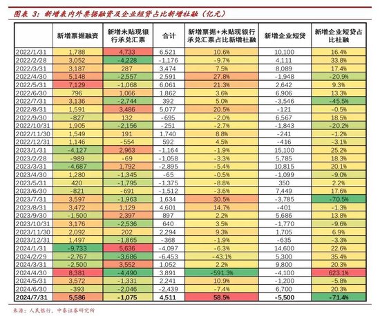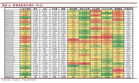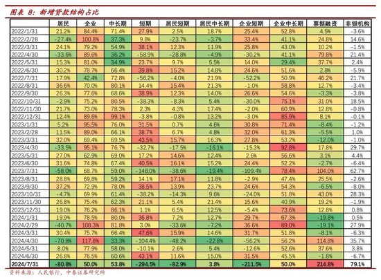 信贷结构分析:1、新增贷款投放结构。票据融资为主。7月新增企业中长贷、企业短贷和票据分别占比50%、-211.5%和214.8%(上月为45.5%、31.5%和-1.8%),新增居民短贷、中长贷占比分别为-82.9%和3.8%(上月为11.6%和15%)。2、7月新增贷款较2023年同期比较:票据同比多增,居民和企业有效需求仍然不足。7月新增贷款较2023年同期少增859亿,其中居民短贷、中长贷分别同比变化-821和772亿。企业短贷和企业中长贷分别同比减少1715和1412亿;票据同比多增1989亿。