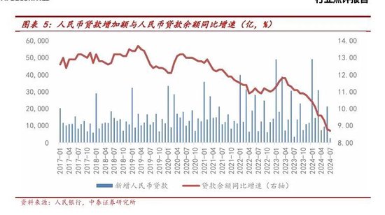 7月新增贷款2600亿元,同比少增859亿元,低于万得一致预期下的4560亿元。信贷余额同比增长8.7%,增速环比上月继续下降0.1%。