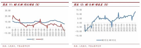 本月M2同比增速小幅回升,M1继续负增且环比有所下降,M2与M1的剪刀差进一步扩大。7月M0、M1、M2分别同比增长12.0%、-6.6%、6.3%,较上月同比增速分别变化0.3、-1.6、0.1个百分点。M2-M1为12.9%,增速差较上月扩大1.7%。