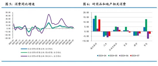从结构来看,一是服务消费增速回落。受高基数影响,7月餐饮收入从上月的5.4%降至3.0%;1-7月服务零售额同比增长7.2%,慢于上半年的7.5%。二是文体娱乐相关消费表现较好。7月体育娱乐用品类消费同比10.7%,明显强于上月的-1.5%。三是耐用品消费改善。7月通讯器材类消费同比12.7%,强于上月的2.9%;汽车消费-4.9%,略好于上月的-6.2%。四是地产类消费降幅收窄。7月家电类消费-2.4%,好于上月的-7.6%;建材类消费-2.1%,好于上月的-4.4%。