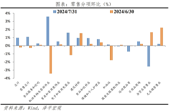 一是,零售超预期,消费保持较强韧性。7月零售销售总额环比1.0%,前值-0.2%;核心零售销售0.4%,前值0.8%。机动车辆、无店铺零售、食品饮料是主要贡献项目,分别占零售总额的18.8%、11.8%和17.3%。具体来看,汽车销售额同比增长0.6%,环比增4.0%;无店铺零售同比增6.7%,环比0.2%;食品饮料同比增2.9%,环比0.9%。