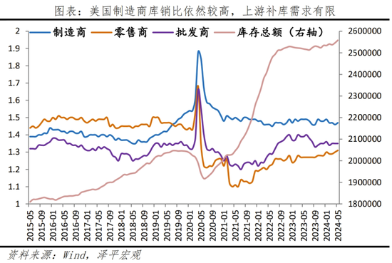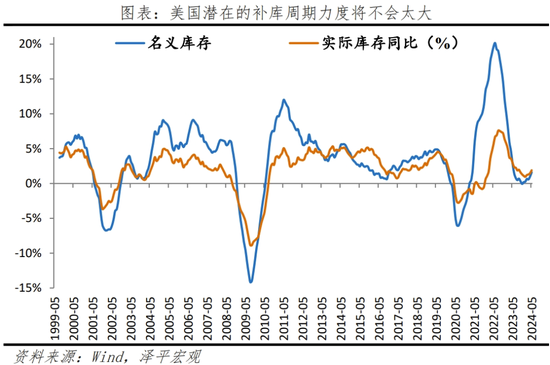 四是,地产链相对疲软,相关投资掣肘经济;补库周期为弱补库。当前美国家庭储蓄率出现下滑,高水平的消费支出可能在长期内难以持续;长期高利率下,需求不足、新屋开工率下滑,拖累住宅投资和建筑投资。二季度住宅投资和建筑投资环比-1.4%和3.3%,较一季度下滑17.4和6.7个百分点。