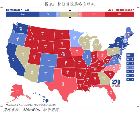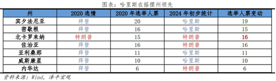 截至8月19日,哈里斯在摇摆州选票领先特朗普。主要摇摆州中,哈里斯在宾夕法尼亚、密歇根、亚利桑那、威斯康星以小幅优势领先特朗普;北卡依旧归属特朗普,预计增加16张选举人票,在佐治亚和内华达领先哈里斯。
