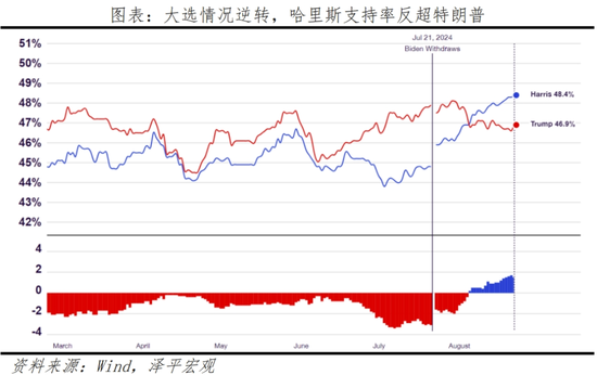 当前选举局势不确定性较强。哈里斯延续“政治蜜月期”,民调支持率高于特朗普,但已确定阵营的票数仍落后于特朗普。