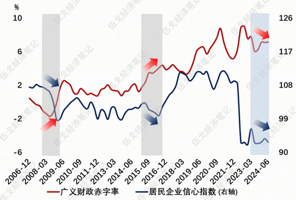 尽管存在债务高低的诸多是非争议,但不争的事实是,当微观主体预期不足时,唯有公共部门“逆势”发力才能弥补需求缺口,避免陷入负向反馈循环。日本90年代陷入价格低迷后财政有所发力,但后期有所退坡,这也加剧了微观预期低迷的时长。