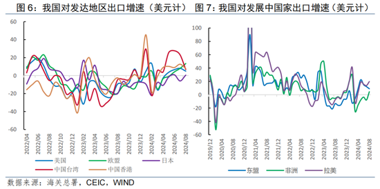 半导体热带动我国对日韩出口增速加快。8月,我国对日本出口增长0.5%,前值-6%,拉动出口增长0.02个百分点;对韩国出口增长3.4%,前值0.8%,拉动出口增长0.1个百分点。8月,日韩两国景气度同步回升,日本制造业PMI为49.8%,高于前值49.1%,韩国制造业PMI为51.9%,连续4个月高于荣枯线,主要得益于全球半导体景气周期对亚洲产业链的带动。