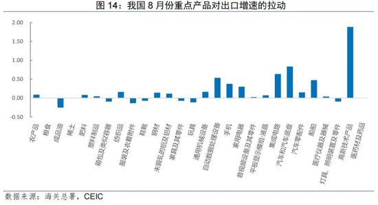 劳动密集型产品出口表现不一。8月,地产产业链中的家用电器出口增长12%,低于前值17.2%,家具出口负增4.5%,美国房地产降温导致对相关产品的进口需求收缩。纺织品出口同比增长4.5%,塑料制品出口增长1.8%,但服装、鞋靴、玩具等出口仍未走出负增长区间。