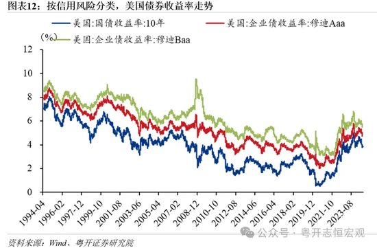 美债表现较为强劲,短期限、低风险的债券受降息提振较大。在5轮降息周期中,美债4次上涨(1995年、2000年、2007年和2019年)。分期限看,短期限债券受降息提振力度较大。美国1年期国债收益率与联邦基金利率相关性较高,降息带动1年期国债收益率定价下调。而10年期美债收益率是一个综合性指标,其定价反映了市场对美国经济基本面、未来通胀和风险偏好的预期,因此10年期国债定价受降息单一因素的影响较小。过去六轮降息周期内,美国1年期和10年期国债收益率分别累计下降988bp、585bp。分信用风险看,债券信用风险越低,收益率降幅越大。过去六轮降息周期内,美国10年期国债、穆迪Aaa级企业债、穆迪Bbb级企业债收益率分别累计下降585bp、下降350bp和上涨14bp。