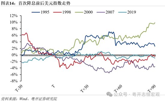 美元短期承压,中长期走势受美国经济的相对强弱以及全球避险情绪等因素影响。美联储降息,美元贬值压力增强。然而汇率还受到国内外经济基本面相对强弱、国际贸易形势、流动性、避险情绪等多方面因素影响。因此,在美联储首次降息之后的3个月内,美元走势难以预测,整体有涨有跌。例如,1995-2002年,受益于美国经济复苏、亚洲金融危机和互联网泡沫破灭的避险情绪,美元维持了长达7年的强美元周期,期间美联储3轮降息并未扭转美元强势表现。