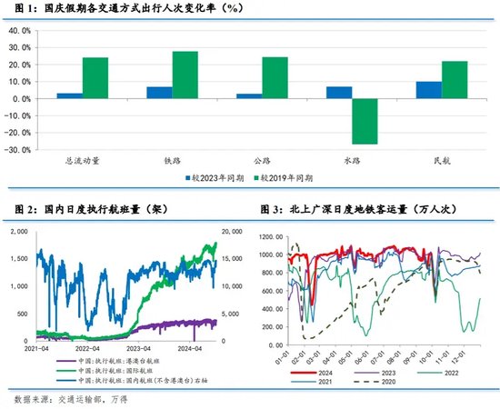出行人次小幅增加。据交通运输部,国庆假期期间,全社会跨区域人员流动量累计20.03亿人次,日均28618.7万人次,同比增长3.9%,较2019年同期增长23.1%。其中,铁路、公路、水路、民航客运量分别同比增长6.3%、3.7%、10.0%、11.1%,较2019年同期变化分别为+27.5%、+23.3%、-27.5%、+22.0%。可见,民航出行增长最快,而公路出行占比较去年同期下降0.2个百分点至92.2%。
