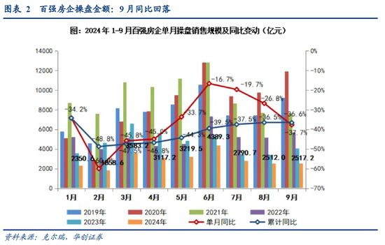从高频数据来看,主要观察两个数据。一是样本城市数据,据wind统计,9月,30大中城市成交面积同比为-32.4%,8月为-24.3%。若城市数量扩围到50城,9月销售面积同比为-29.2%,8月为-27.3%。二是样本企业数据。根据克尔瑞统计的百强房企数据,“企业层面,9月TOP100房企实现销售操盘金额2517.2亿元,环比微增0.2%,业绩表现不及往年同期。同比降低37.7%,同比降幅较8月进一步扩大11个百分点。”