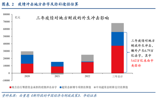 中央对地方承担的抗疫等类中央事权做补偿:今年3月清华大学经管学院院长白重恩在长安讲坛发表的题为《新阶段的中国经济与财政政策》的演讲,估算了2020-2022年疫情冲击地方赤字规模。三年疫情,地方额外产生近7万亿元赤字,其中中央仅弥补约1万亿,地方仍剩余约6万亿历史遗留赤字,中央或通过两条路线,缓解地方财政困难: