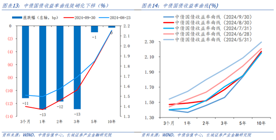 整个9月,10年期国债利率经历了先下后上的走势,下行过程中正式突破了2.1%,最低触及2.0%附近,这一时间点比我们之前的预期来得更早,体现了9月中上旬市场极度的做多情绪和抢跑意愿。我们认为原因有以下几点:首先,海外降息周期开启,9月美联储降息50个基点,而国内市场在整个9月上半月一直在博弈降准降息,宽松预期极大助推了债市的做多情绪。其次,9月24日新闻发布会上,降准降息正式落地,并且幅度超出市场预期,带动利率下探至新低。再次,9月保险等机构对超长债的配置意愿增强,使得30年期国债利率的下行幅度大于10年期利率,二者互相影响。最后,9月期间央行并未过多干预债市利率下降,股市也持续下跌(直到9月20日左右才企稳),在股债跷跷板效应下,也进一步推动了10年期国债的做多情绪。