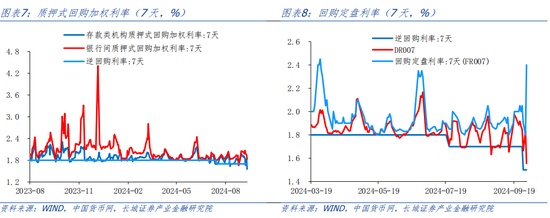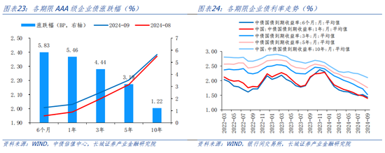 资金利率方面,7天存款类机构质押式回购加权利率(DR007)在8月29日央行买短卖长,购入4000亿元特别国债的当日下降15BP,而后逐步回升;在央行公布8月金融数据的第二天单日下降16BP,下一个交易日又迅速反弹回更高水平。截止至9月30日DR007为1.56%,较8月23日的1.85%大幅下降了29BP,在9月27日央行正式降准降息时由1.85%陡降至1.66%,9月29日虽迅速回升至1.83%,但第二日便单日下跌28BP至1.56%,此前持续维持波动变化的状态;7天银行间质押式回购加权利率(R007)为1.83%,较8月23日的1.92%也下降了9BP左右。如果看月均值,8月DR007为1.79%,R007为1.88%,而9月两者月均值为1.79%和1.93%,7日回购利率受近期各类债市冲击事件影响,短期大幅波动频繁,但总体来看,还是维持在月均值上下。