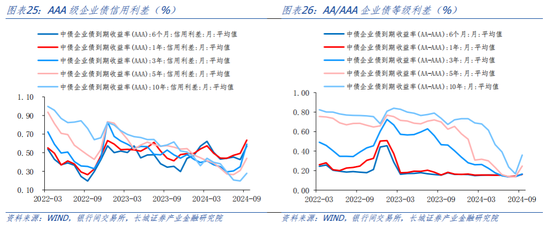各期限AAA等级企业债收益率较上月平坦化上行,截止9月30日,6个月/1年/3年/5年/10年期品种收益率分别较8月整月上行6BP/5BP/4BP/3BP/1BP至2.01%/2.03%/2.12%/2.20%/2.38%,短端利率上行幅度大于长端。信用利差方面,截止9月30日,各期限AAA等级信用利差与8月相比全面扩大,各期限利差分别扩大约15BP/14BP/24BP/13BP/8BP。AA/AAA等级利差中,截止9月30日,各期限等级利差同样全面扩大,长端等级利差扩幅较大,5年期等级利差扩约11BP,10年期等级利差扩约19BP,近乎翻倍。