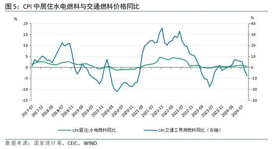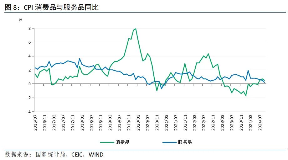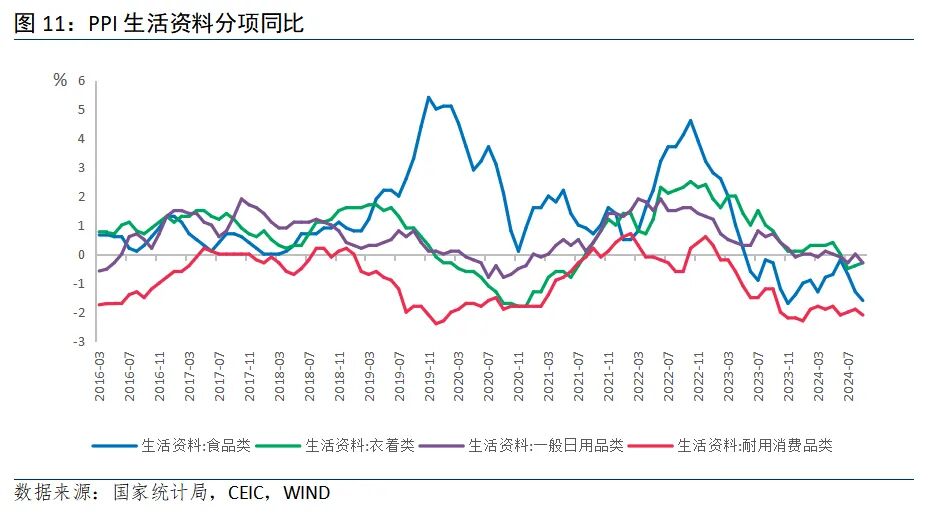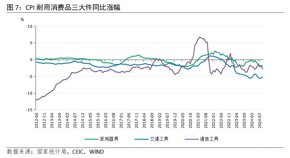 耐用消费品环比均降,降幅收窄。“耐消三大件”中,家用器具环比下降0.2%,降幅较上月收窄0.5个百分点,同比下降2.0%,降幅扩大0.2个百分点。交通工具环比下降0.1%,降幅收窄0.2个百分点,同比下降5.3%,降幅收窄0.2个百分点。通信工具环比下降0.6%,降幅较上月收窄0.2个百分点,同比下降2.8%,降幅扩大0.7个百分点。整体而言,家用器具受房地产刺激政策显效及家电以旧换新的带动,价格改善幅度最大,交通工具类、通讯工具类受以旧换新政策加码的带动也有所好转。