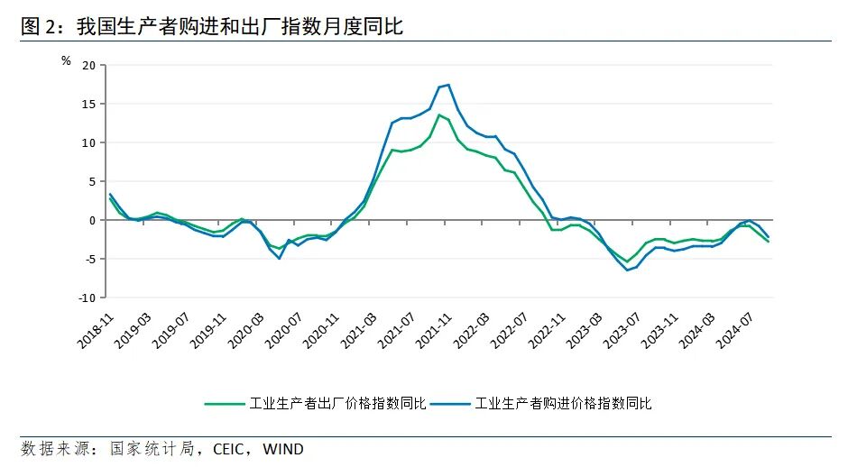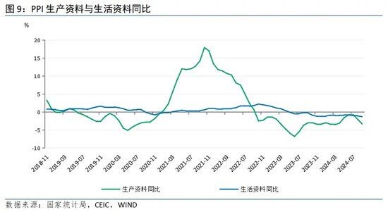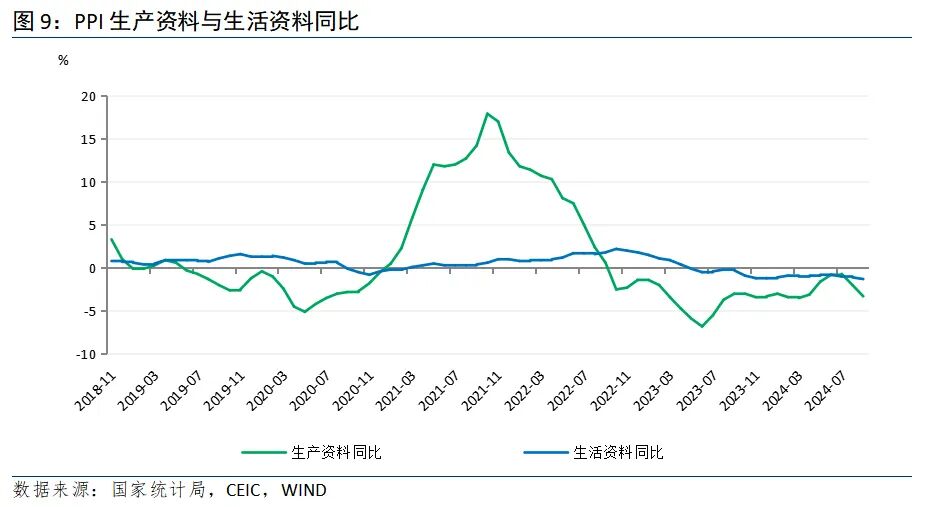 整体看,9月PPI同比降幅走扩。从国际看,9月全球商品价格涨跌互现,美联储超预期降息之后,市场偏好上行,国际原油和其他大类资产价格共振上涨,但随后出现分化。原油受利比亚供应端有望复产以及OPEC+将推进12月增产消息影响,开始转向下行。但工业金属如铜、铝等受中国一系列宽松政策刺激继续上涨。不过,美欧等发达经济体制造业放缓,外部需求回落仍是大概率事件,叠加中东地缘政治风险加剧等因素,带来我国工业品价格传导趋于减弱。从国内看,当前我国工业企业依旧面临国内有效需求不足问题,消费弱势运行自下向上传导至生产环节,制造业投资、基建投资放缓,房地产开发投资大幅不及往年,导致下游价格下行压力要大于上游,主要体现在设备制造和耐用消费品领域。
