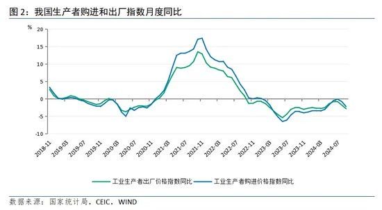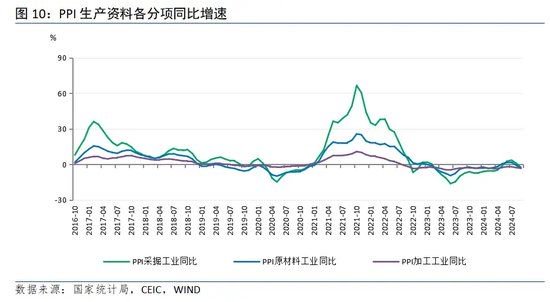 展望下一阶段,一方面,主要发达国家经济放缓带来外需放缓,全球商品价格有回落可能,对我国上游工业品价格形成向下传导压力。另一方面,国庆前后密集出台的宽松政策,或将提振居民消费需求、继而促进工业生产,叠加未来两个月去年基数回落,预计PPI同比有小幅改善的可能性,但走出负区间仍需要一段时间。