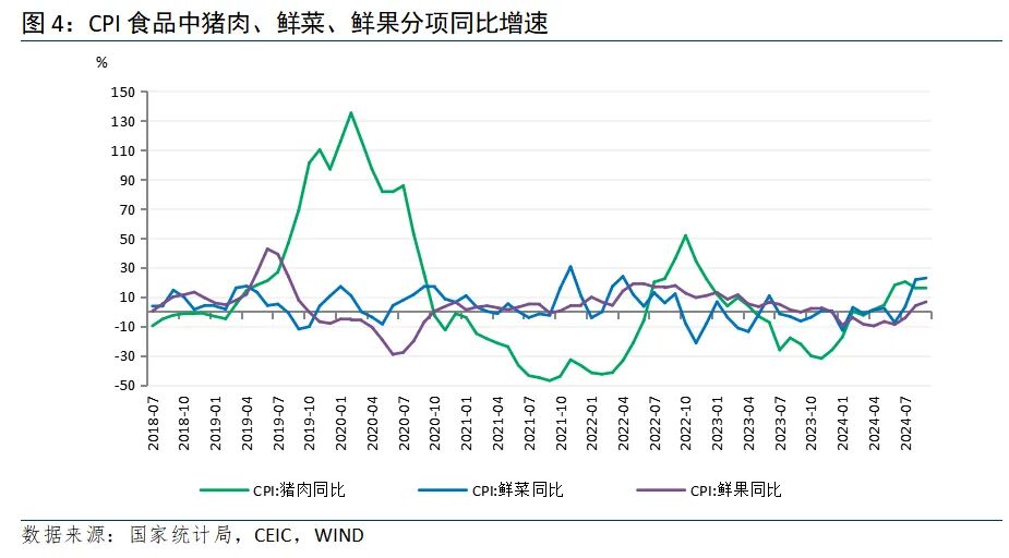 天气因素导致鲜菜、鲜果等表现强于季节性。9月鲜菜价格环比上涨4.3%,较上月的18.1%大幅回落,强于历史9月平均环比水平(3.1%),同比由8月的21.8%上升至22.9%。鲜果环比上升2.1%,低于上月的3.8%,强于历史9月平均环比水平(1.8%),同比由8月的4.1%升至6.7%。主因是南方多地台风导致短期供给收缩。鸡蛋价格环比上涨2.1%,涨幅回落0.7个百分点,低于历史9月平均环比水平(3.8%),同比由8月的下降3.5%变为下降4.1%,为天气转凉后产蛋量上升所致。水产品环比下降0.5%,高于历史平均9月环比(-0.9%)。