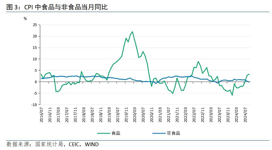 鲜菜、鲜果及蛋类价格上涨推升食品价格小幅上行。9月食品环比上涨0.8%,较上月的3.4%有明显回落,且低于历史9月平均环比水平(1.0%),主因是鲜菜和鲜果及蛋类价格上涨,但猪肉价格仅微涨,明显弱于季节性,导致食品价格上涨幅度低于历史均值。