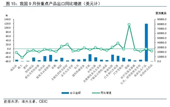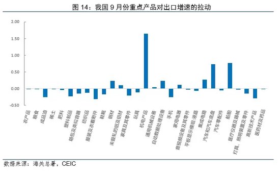 劳动密集型产品出口放缓。9月,地产产业链中的家用电器出口增速由12%收窄至4.5%,家具出口降幅由4.5%扩大至12.3%,美国房地产降温导致对相关产品的进口需求收缩。服装、纺织、箱包、鞋靴、玩具、塑料等轻工制品出口增速均有不同程度下滑。