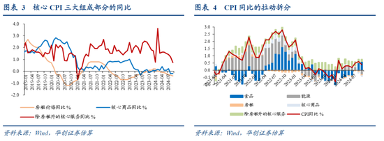 CPI同比从0.6%降至0.4%,主因核心CPI同比再度回落。从大类来看,食品价格同比从2.8%升至3.3%,能源价格同比从-1%降至-3.5%,核心CPI同比从0.3%降至0.1%。核心CPI中,核心商品同比持平于-0.2%,其中,新能源小汽车和燃油小汽车价格分别下降6.9%和6.1%;租赁房房租同比从-0.3%降至-0.4%;不含房租的核心服务价格同比约从1.2%降至0.7%。(不含房租的核心服务价格为华创宏观估算,非官方公布值)
