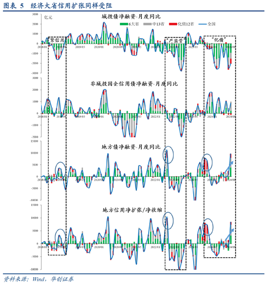 d)经济大省挑大梁存在压力。1-8月,六个经济大省固定资产投资累计增速均值为2.2%,低于全国的3.4%。其中,经济第一大省广东,1-8月固投增速仅为-2.9%。从经济大省的信用扩张情况来看,今年扩张明显受阻,1-8月,经济大省城投净融资额累计同比少增7195亿。