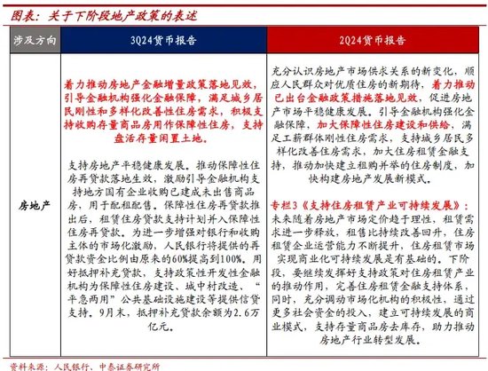 (3)把促进物价合理回升作为把握货币政策的重要考量。物价延续温和回升态势,今年前三季度CPI同比上涨0.3%,其中三季度上涨0.5%。四季度将逐步进入消费旺季,叠加近期一揽子增量政策加力推出,对有效需求和宏观经济的拉动作用也会逐步显现,物价温和回升仍有基础。报告指出年内CPI有望延续温和回升态势,PPI降幅也会总体收窄。对于中长期形势,延续Q2报告中的“经济转型和产业升级稳步推进”,重申“物价保持基本稳定有坚实基础”。对于经济供求关系的措辞的表述略有差异,由此前的“供求关系持续改善”调整为“更加均衡”