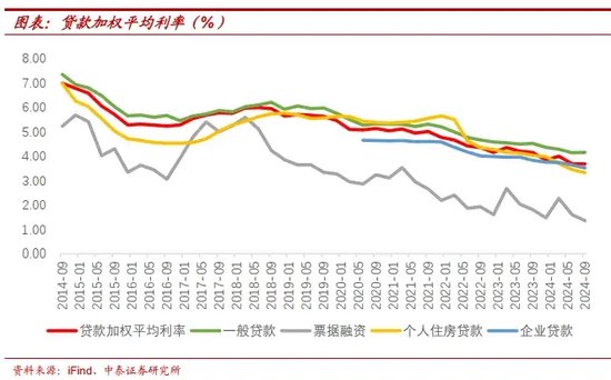 一般贷款加权平均利率有所企稳,企业贷款利率降幅仍较大。在政策引导下,金融机构加大了对企业融资的支持力度,整体融资环境适度宽松。9月新发放企业贷款加权平均利率为3.51%,较6月进一步下降12bps,较2023年同期下降31bps。新发放贷款加权平均利率较6月下降1bp至3.67%,一般贷款加权平均利率较6月回升2bps至4.15%。