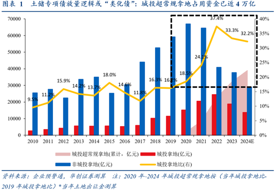 为何政策量级或有4万亿?提供一个参考视角:疫情以来,一些地方政府由于卖地不畅,让城投托底土地市场,对其形成较大资金占用;我们测算2020~2024年城投超常规拿地占用资金近4万亿,土储专项债或以“类化债”逻辑,大额释放这部分流动性(具体土储专项债是否全部、何种节奏支持城投,尚不清楚,仅从支持地方政府角度,提示一个支持该工具放量的视角)。