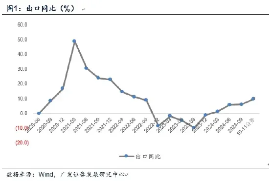 第一,11月出口在基数显著抬升的背景下依然取得同比6.7%的增速。今年前三个季度出口同比分别1.1%、5.6%、6.0%,10-11月合并增速进一步提升至9.6%。前11个月出口累计同比为5.3%。