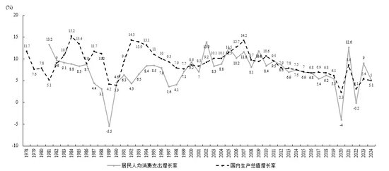 图1:1978-2024年居民人均消费支出和GDP实际增长率