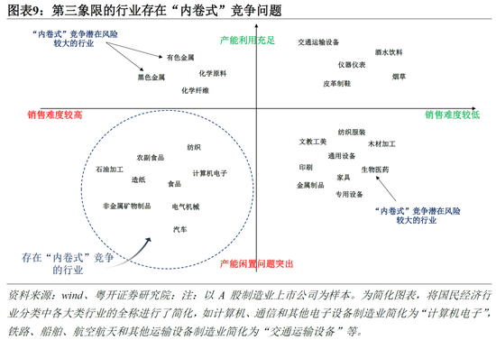 其一,从行业覆盖范围看,供给侧改革集中在钢铁、煤炭、水泥等中上游行业和传统行业领域,是房地产、基建的上游行业;而反内卷覆盖面更广,上、中、下游行业均有覆盖,而且向“新三样”、平台经济等新领域扩散。结合产能利用情况和销售难易程度,大致可以认为,存在产能闲置问题且销售难度加剧的行业已经面临较严重的“内卷式”竞争问题。当前“内卷式”竞争主要集中在以下三大类行业: