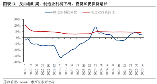 正是由于原因不同,面对需求下行时,供给侧改革时期企业投资随盈利恶化而回落,产能随之收缩;而反内卷更多发生在技术更新迭代迅速、技术路线和行业格局尚未定型的新兴领域,企业一旦停止投入就可能彻底失技术优势和市场份额,因此企业即便短期亏损,也必须持续投入以争取未来生存空间,形成了“越亏越投”的独特困境。供给侧改革前期,供给侧改革行业工业利润增速由2014年初的-24.1%下滑至2015年末的-58.9%,制造业投资增速从2014年初的8.2%跟随式下滑至2015年末的-14.4%。而本轮反内卷时期,制造业工业利润增速自2022年以来多数处于负值区间,但制造业投资却保持在10%左右的较高增速。