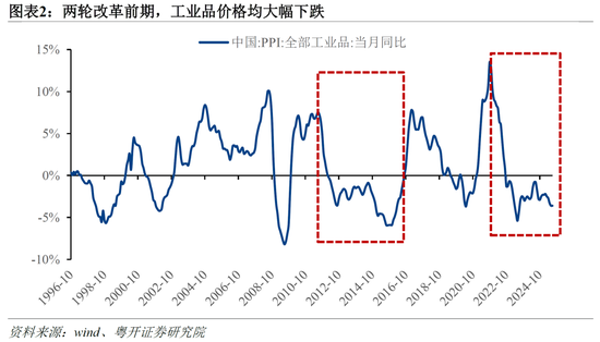 二是工业品价格大幅下跌。供给侧改革时期,产能过剩领域库存积压,厂商纷纷降价竞争, PPI从2012年3月起陷入长达54个月的负增长,持续时间创历史纪录。反内卷时期,PPI自2022年10月起陷入负增长,截至2025年7月已持续34个月。