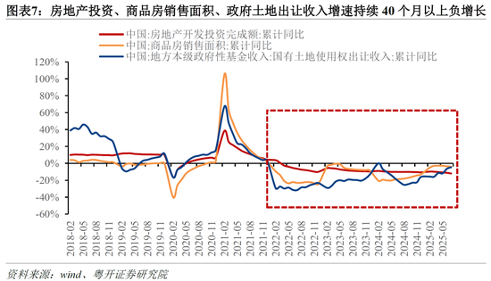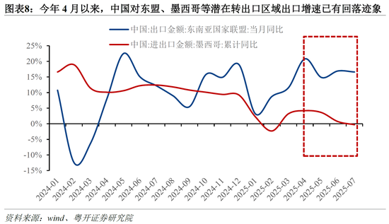 反内卷时期,房地产处于深度调整的下行周期,且关税战对出口的不利影响可能逐步显现,需求不足问题更为突出。内需方面,当前人口总量减少以及房地产供需形势逆转,房地产处于深度调整的下行周期,导致投资、销售、土地市场持续低迷。2025年1-7月,房地产投资、商品房销售面积、政府土地出让收入分别同比下降12.0%、4.0%和4.6%,均连续40个月以上负增长。房地产市场持续低迷不仅直接拖累总需求,还会通过土地出让收入下降间接掣肘财政支出,通过财富缩水限制居民消费潜力。外需方面,关税战对出口的不利影响可能逐步显现,上半年为应对关税不确定性而出现的“抢出口”和“转出口”效应可能会减弱。一方面,虽然当前我国出口仍然具有韧性(2025年7月出口同比增长7.2%),但美对华实际关税税率仍高达40%,未来“抢出口”效应将逐步消退。另一方面,美国试图对中国转出口地区加征高关税,围堵中国企业转出口。目前,美国对东盟、墨西哥等中国潜在转出口地区征收的关税普遍高于日、韩、欧盟等区域,今年4月以来,中国对东盟、墨西哥的出口增速已出现回落迹象。