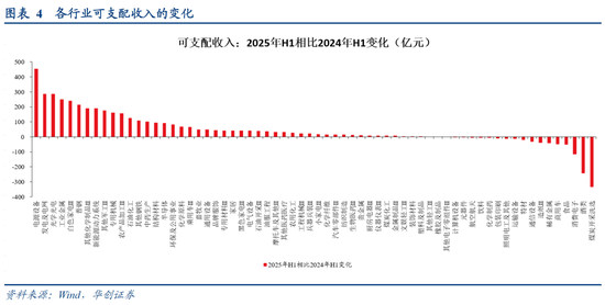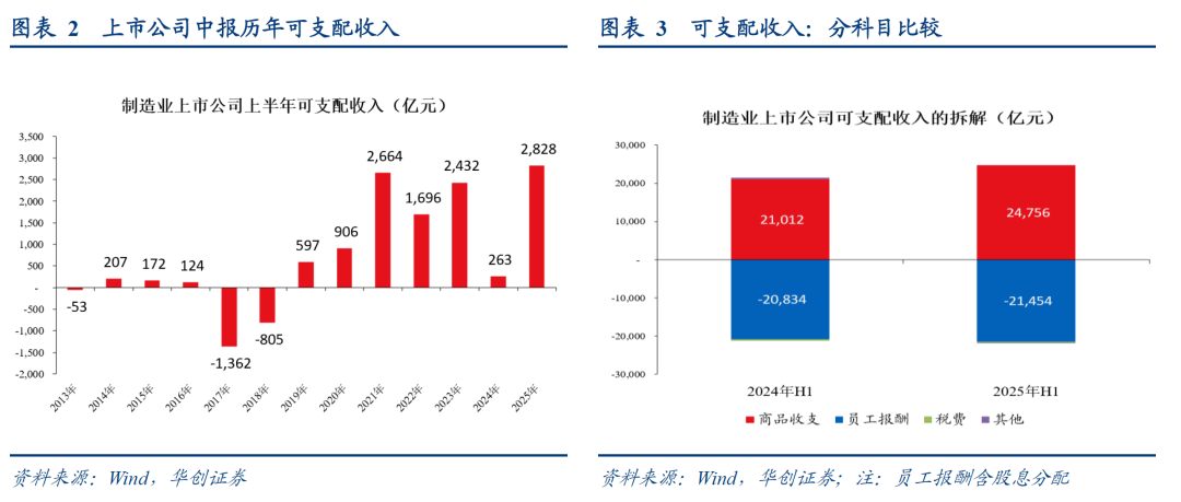 2025年上半年,制造业上市公司可支配收入为2828亿,去年同期为263亿。从可支配收入的构成来看,主要是商品收支、员工报酬(含股息)两项体量较大。2025年上半年相比2024年上半年,员工报酬(含股息)同比增长3.0%,但商品收支同比增长17.8%。从行业来看(中信二级),可支配收入改善较为明显的是电源设备、发电及电网、光学光电、工业金属、白色家电、普钢等。可支配收入相比去年有所走弱的是煤炭、酒类、消费电子、食品、商用车等。