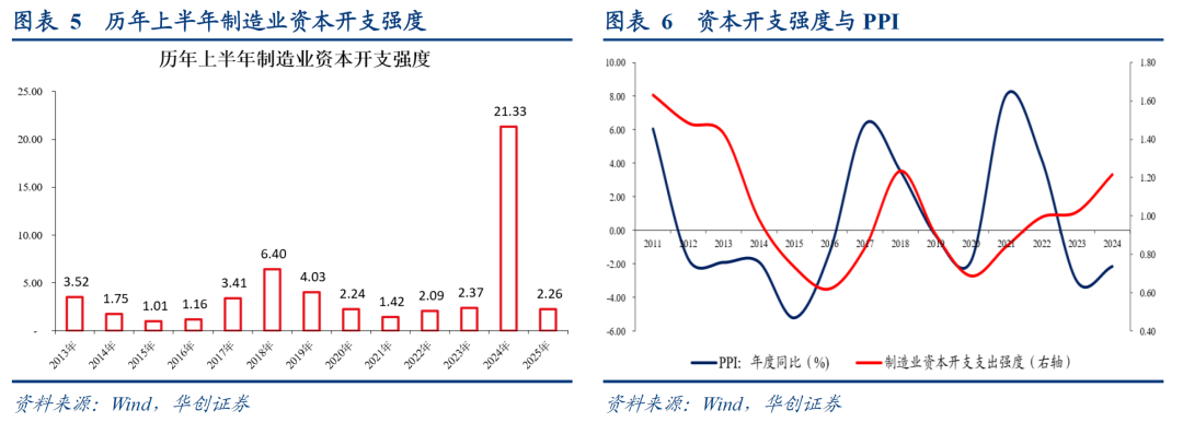上半年的数据来看,制造业资本开支强度指数降至2.26,属于2017年以来同期的较低水平,仍高于2020-2022年同期,但大幅低于去年的21.33。