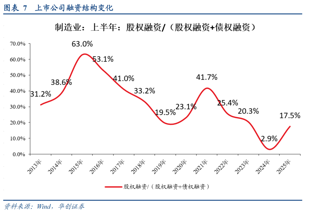 我们观察上市公司融资结构,即使用当年的股权融资除以股权融资与债权融资之比。2025年上半年,制造业股权融资规模为1384亿,债权融资规模为6533亿,股权融资之比为17.5%,这一比例大幅好于去年同期的2.9%。但与2013年以来的其他年份的同期数据相比,尚属于偏低位置,后续股权融资占比或仍需要上升。
