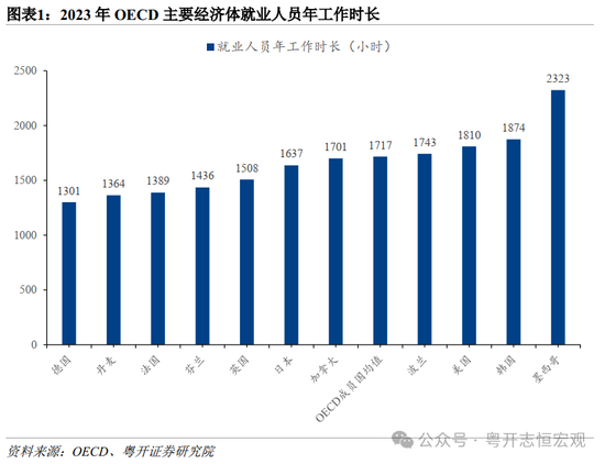 根据国家统计局数据,2023年全国企业就业人员周平均工作时间约为49小时,粗略估计年工作时长约2500小时,高于OECD 38个成员国就业人员均值的1717小时,也高于发展中国家墨西哥的2323小时。